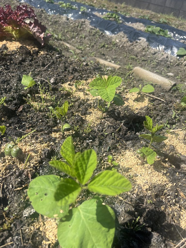 5月半ばに種子を蒔いた枝豆から本葉がでました。