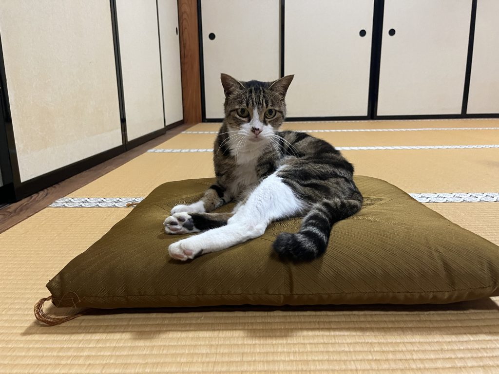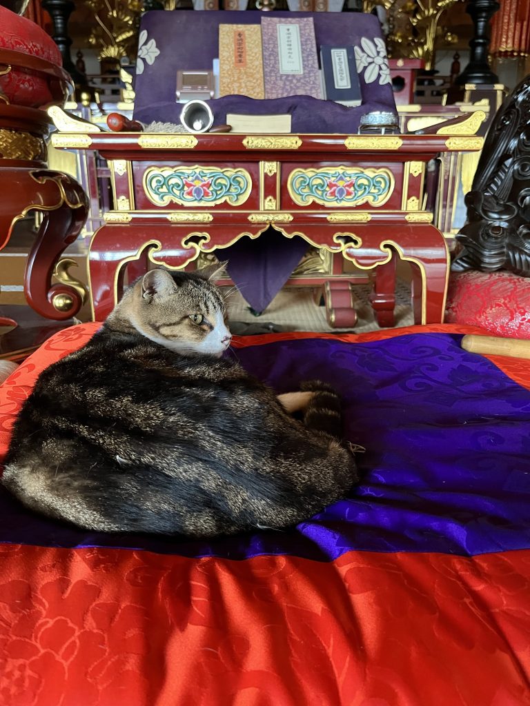 推定16歳?の老猫です。住職が本山での修行から戻って来てからずっと一緒にお寺を守ってくれています。妹猫達を見守り、亡くなった祖父母にもとても懐いていました。お檀家さんが集まる法要には、僕も参加するぞ!と言わんばかりに本堂の真ん中で座っています。
