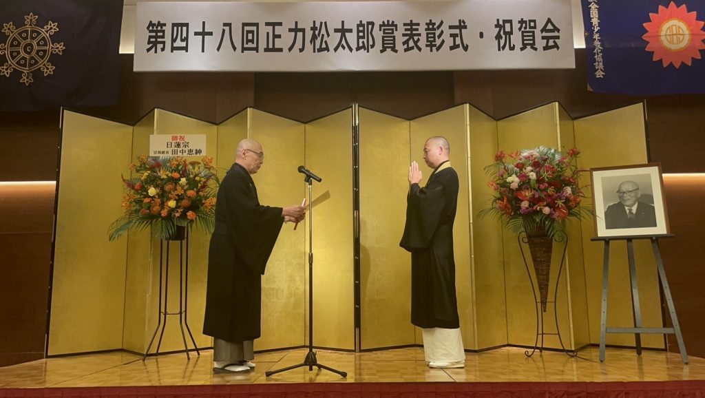 正力松太郎賞とは、仏教精神に基づき青少年・幼児の健全な育成に貢献した個人・団体に与えられる賞です。和太鼓集団「鼓司」は2006年に創立し、凡そ20年間和太鼓を通じて仏教、曹洞宗を少しでも身近に感じてもらおうと活動を続けて来ました。この度、この名誉ある賞を頂けた事は私達の和太鼓演奏指導、作曲、舞台プロデュースを頂いている津市在住太鼓奏者 服部博之氏、そして創立当初のメンバーの勇気ある挑戦と弛まぬ努力のおかげだと感謝しております。