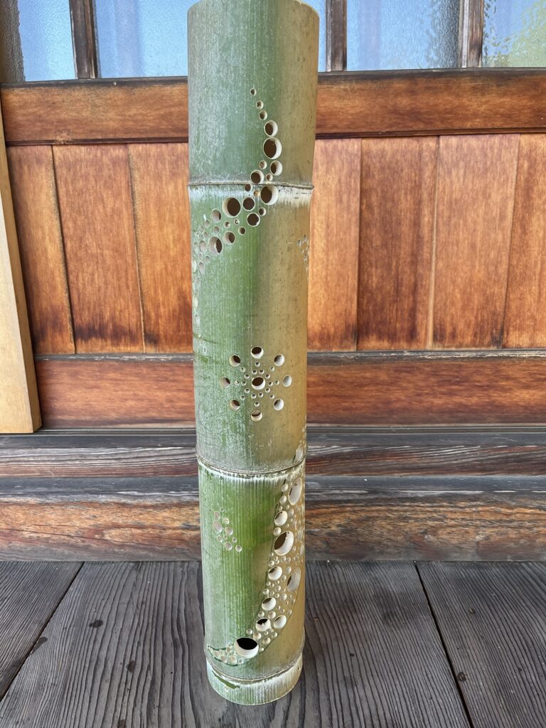 幼馴染のお父さんに師事して竹灯籠を作りました。青竹の重さ、頑丈さに驚きました。模様を描くのは時間が掛かりますが楽しく出来ました。少なくともあと一対は作りたいと思います。