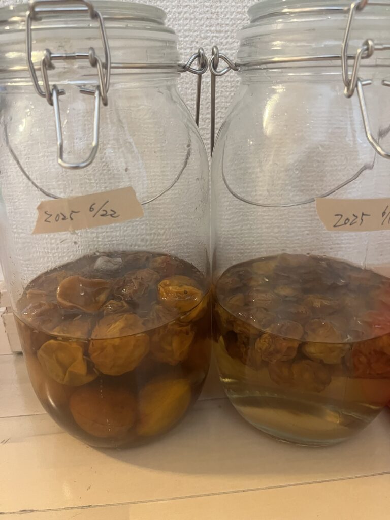 6月に弁天山で採れた梅を漬けたシロップが完成しました。1つはプレーン、もう1つはシナモン、クローブ、カルダモン、クミンも一緒に漬け込んだスパイス梅シロップです。