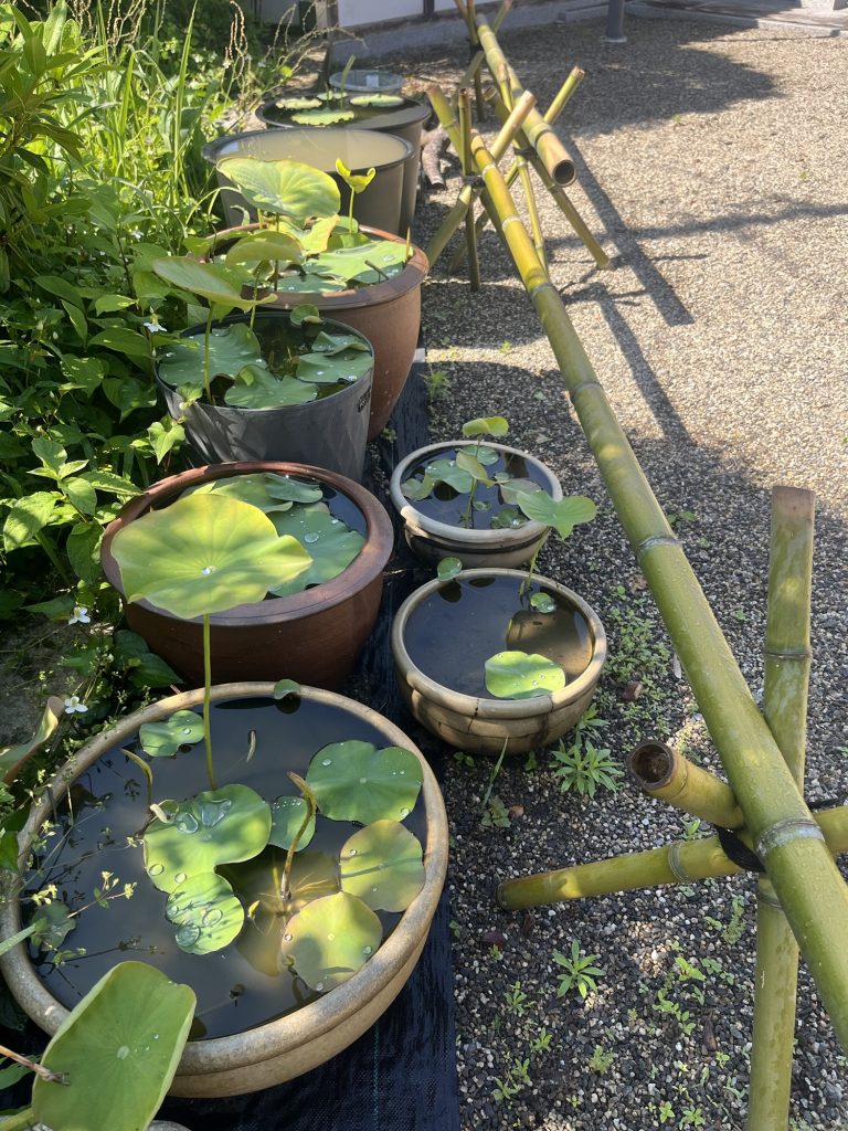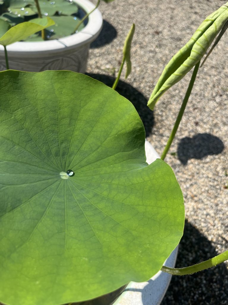 蓮の立ち葉が出て来ました。連日の雨から今日は暖かい日になりました。蓮の葉に雨の雫が綺麗な宝石のように宿っています。